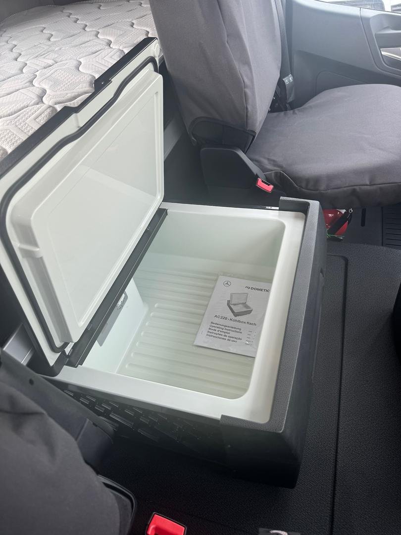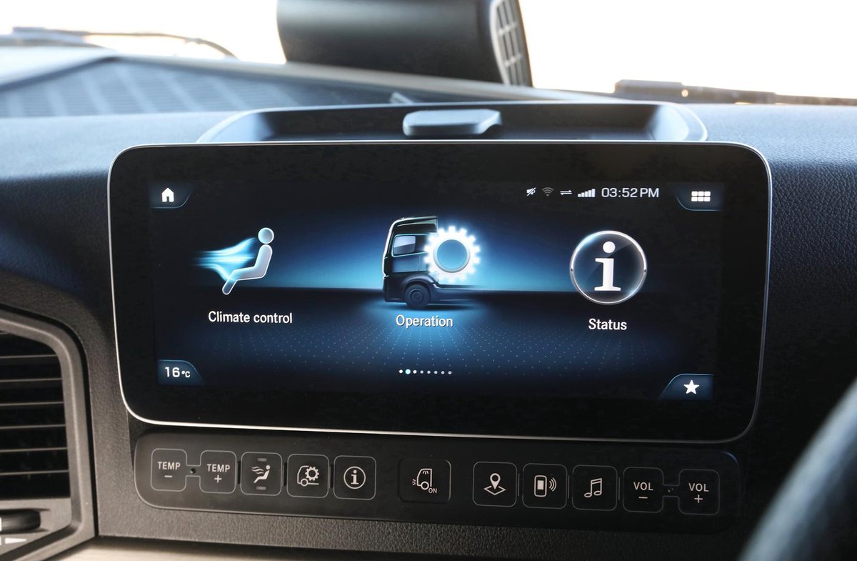 Cabin • Kerb mirror and main mirror, manoeuvring setting, co-driver's side • Driver and co-driver sunblind • Seat belt monitor • Air horns, cab roof • Air deflector, snap-in, with cab side deflectors • Sun visor exterior transparent with chrome highlight • TrendLine interior design with ambient lighting, chrome trim, carpet on engine tunnel • Leather steering wheel • Driver and co-driver air sprung comfort leather suspension seat • Luxury bed, bottom, inner spring • Luxury bed, top, wide, with levelling control • Multimedia Cockpit, interactive • Comfort telephony, wireless charging • Cruise control and speed limiter • Travel computer, on-board diagnosis and maintenance system • Truck navigation • DAB radio • Premium loudspeaker system with additional speakers • 24 V/15 A co-driver footwell sockets • Automatic climate control • Pull out tray table on passenger side • Stowage flap and compartments above windscreen • Stowage compartment exterior flap, left and right • Mercedes star, illuminated from behind in dark chrome • Dark chrome badging • Two 30 l pull-out refrigerators under bunk