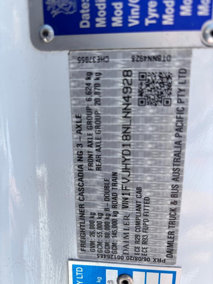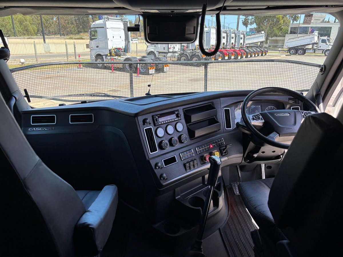 2021 Freightliner Cascadia 126 145000kg road train prime mover, Detroit DD16 600hp engine, Eaton 18 speed Roadranger manual transmission, Spicer R52-160 drive axles on Neway air bag suspension, alloy bull bar, 60" integrated sleeper with dual bunks, Dometic draw fridge, Bushman upright fridge, UHF, Icepack air conditioner, 50mm K Hitch fixed turntable, conveyor guards, water tank, tool box, lockable isolation switch, In excellent condition ex major fleet and has been maintained by Velocity on a service & maintenance plan. low km and ready to go